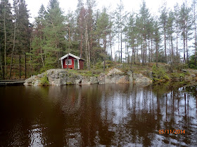 Idyllisk ved vannet midt i Steinbekken (oppdemmet?) ved Blekkhus Skeetbane det Sarpsborg JFF har sin flotte hytte (ikke den lille på bildet). Posten er på kollen ved siden av den lille stua.