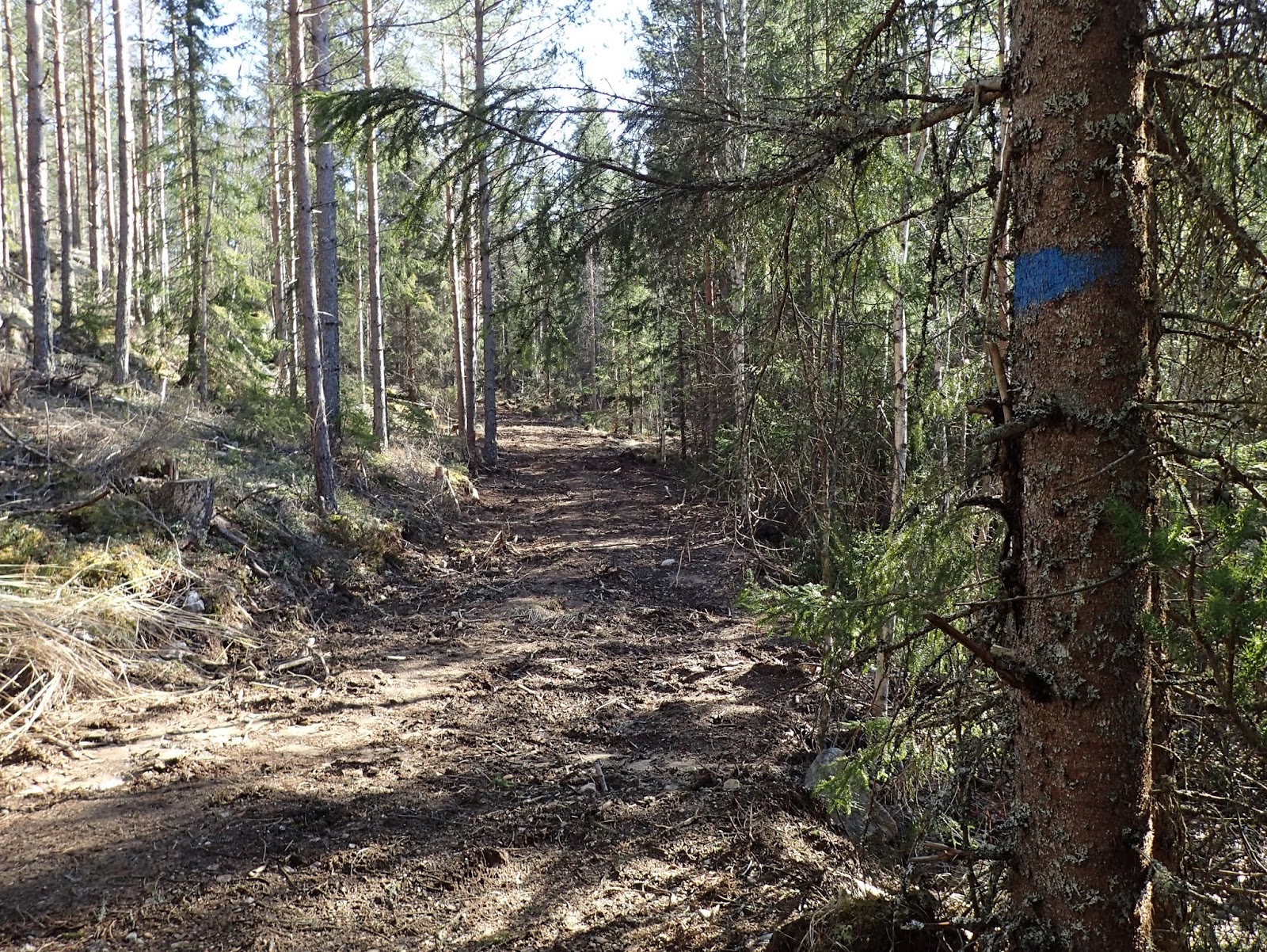 Etter en drøy kilometer helt uten merking, men langs et hogstslep, fant jeg et merke på to trær i løpet av kort tid. Kjekt å få bekreftet at jeg var på rett vei - kartet er jo mildt sagt detaljfattig.